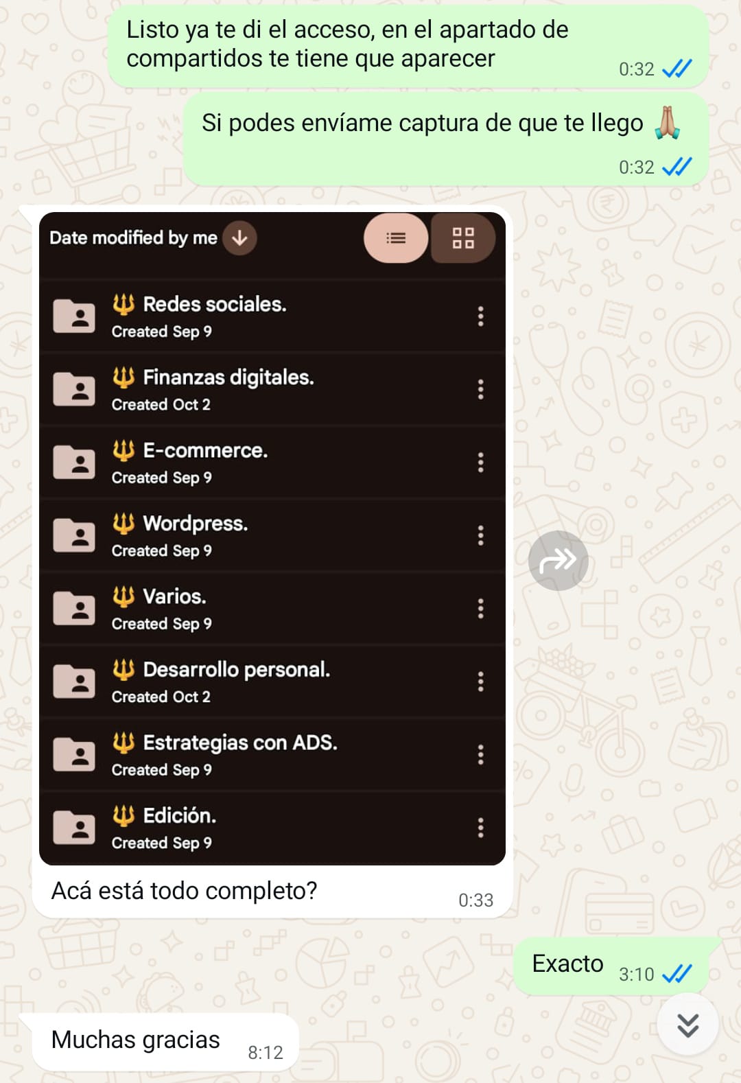 Una vez completado el pago, nuestros agentes te mandarán el acceso a tu email en Google Drive, específicamente en la sección "Compartidos".